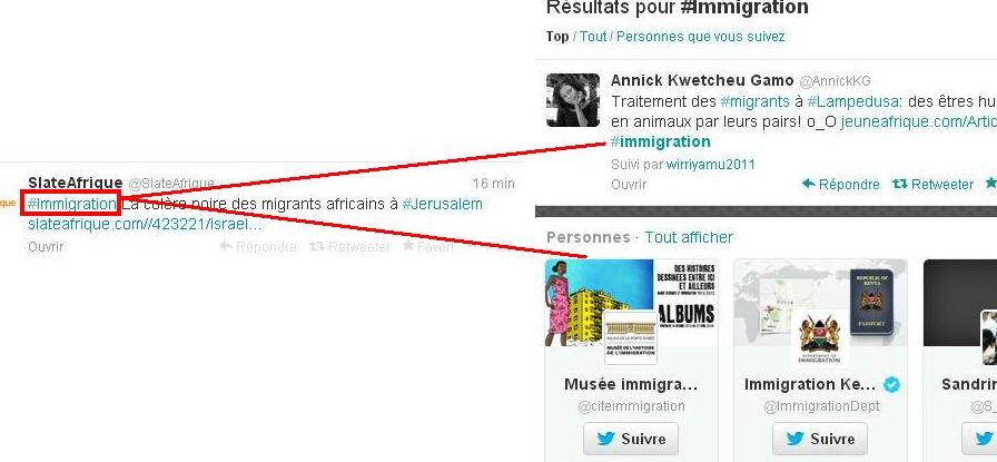 Dans l’exemple ci-dessous, SlateAfrique a dans son tweet 2 hashtags (#Immigration et #Jérusalem). Si je clique sur l’un deux je vais découvrir tous les tweets s’y référant.